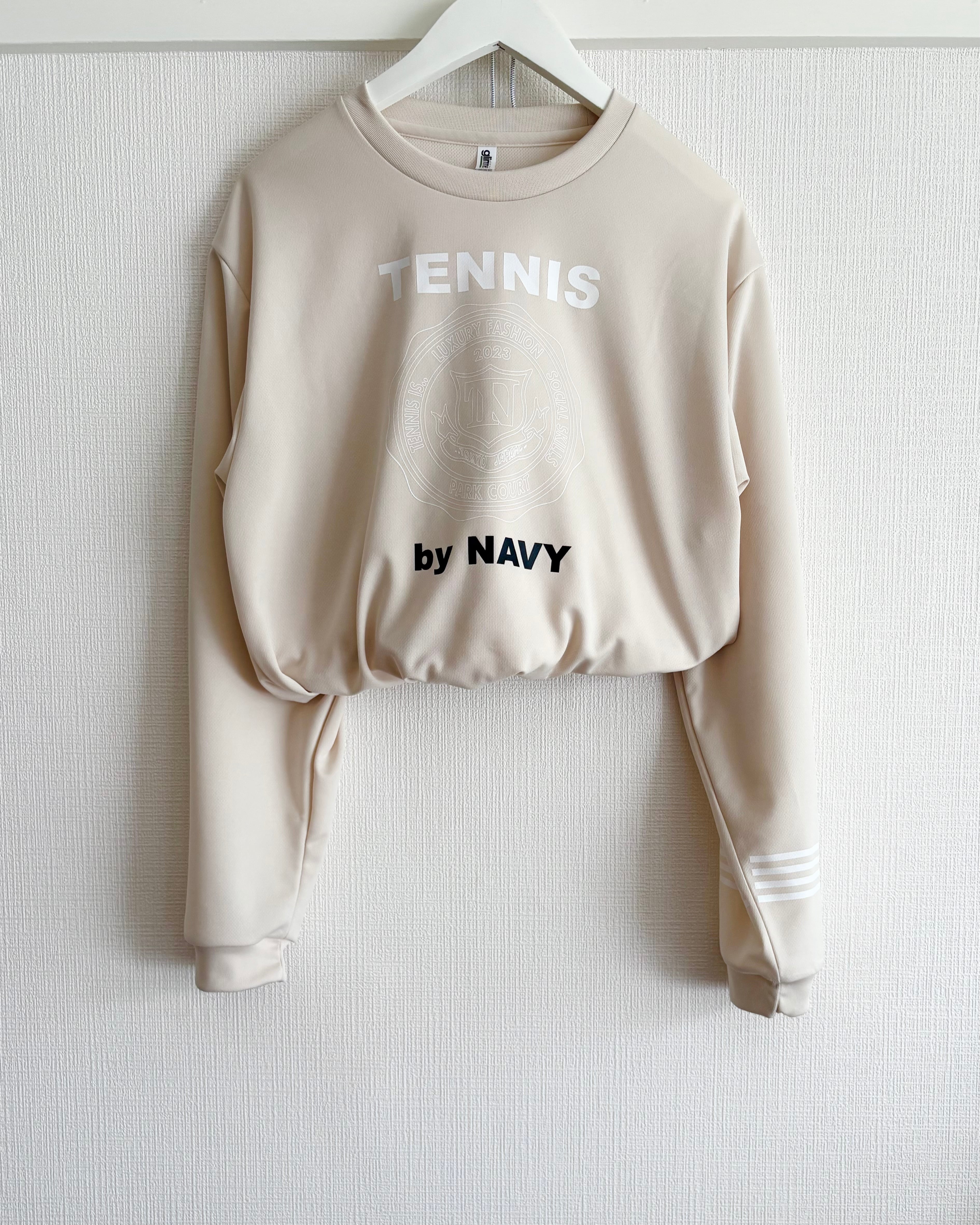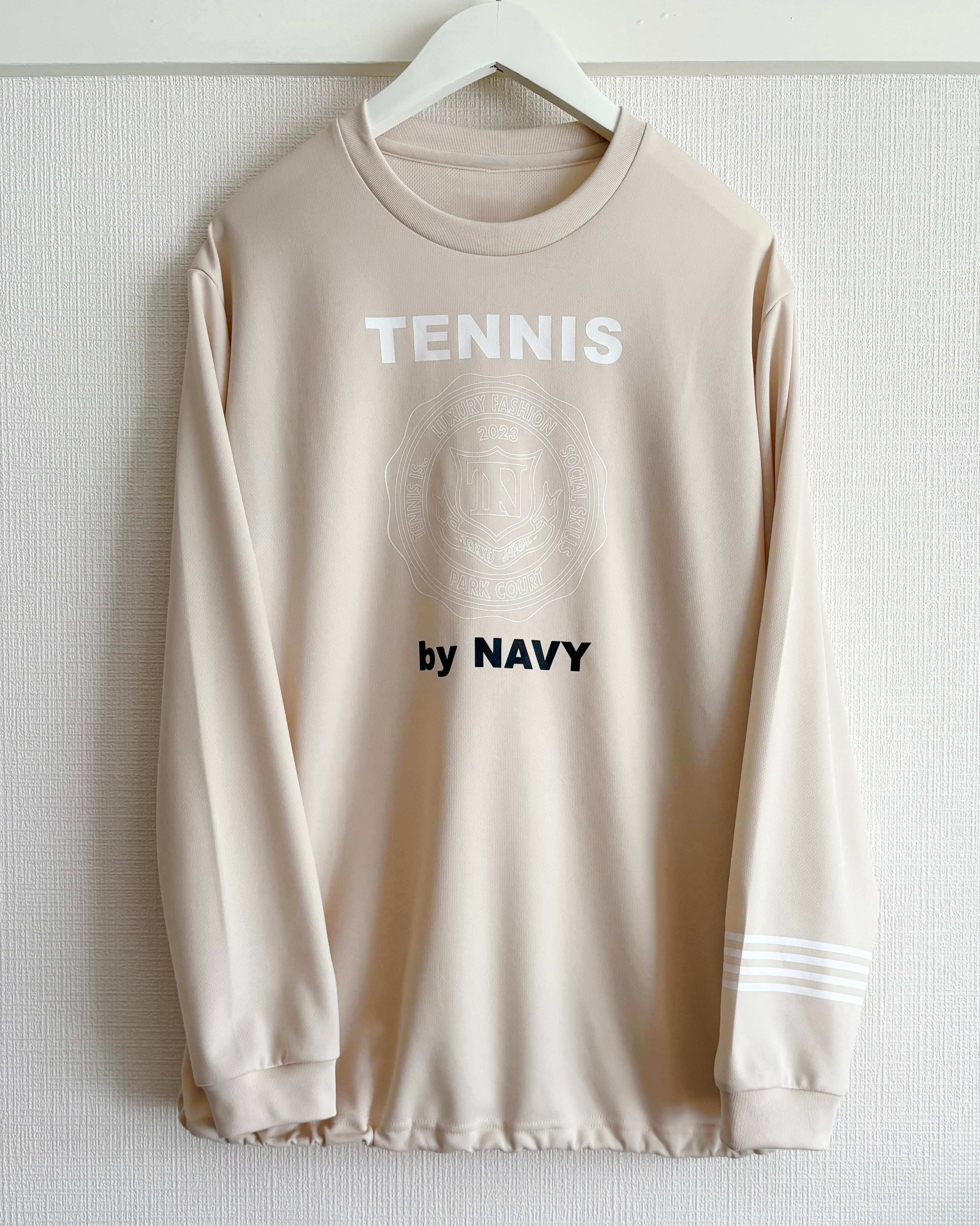 エンブレムが控えめに配色されたライトベージュTシャツ